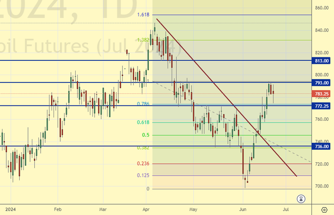 Сценарий роста: рассматриваем июльский фьючерс, дата экспирации 11 июля. При откате к 740.00 можно купить.