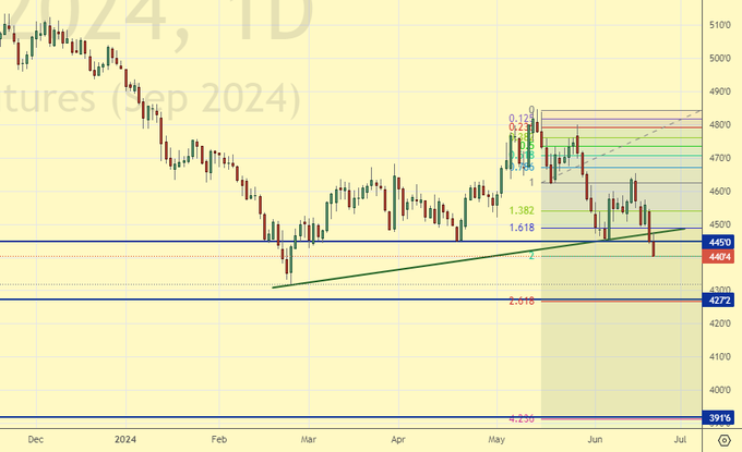 Продажа: нет. Кто в позиции от 463.0 (с учетом перехода на следующий контракт), перенесите стоп на 458.0. Цель: 393.0.