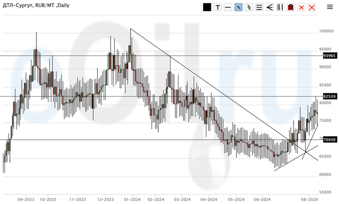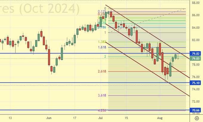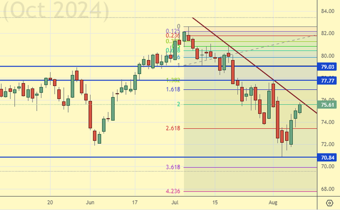 Сценарий роста: рассматриваем августовский фьючерс, дата экспирации 30 августа. Пока воздерживаемся от покупок. Думать после роста выше 80.00.