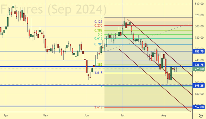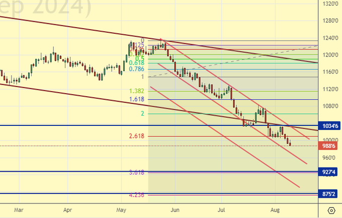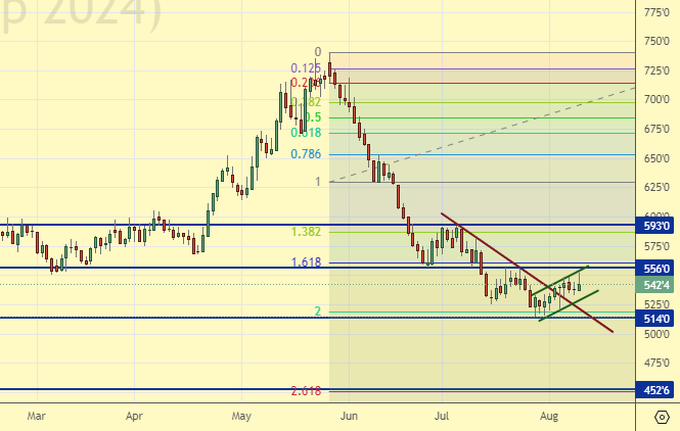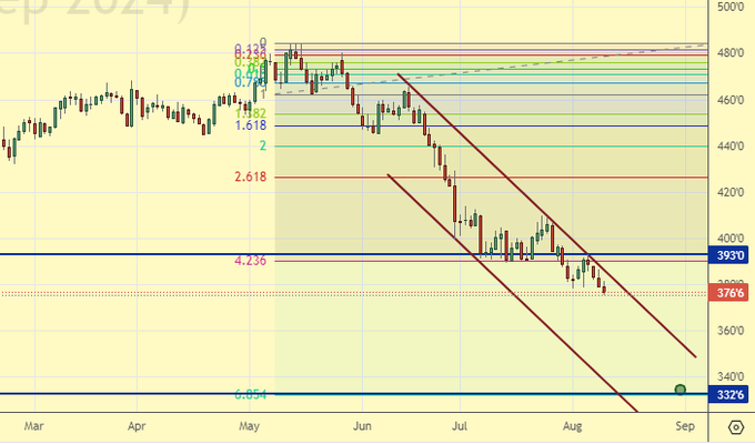 Сценарий роста: рассматриваем сентябрьский фьючерс, дата экспирации 13 сентября. Ждем низких цен. Рынок способен пройти глубже на фоне нового урожая.