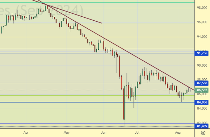 Сценарий роста: рассматриваем сентябрьский фьючерс, дата экспирации 19 сентября. Рынок способен пройти выше 88000, если это произойдет, то мы быстро пойдем к 91700.