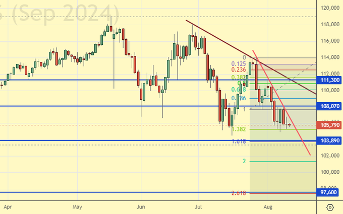 Сценарий роста: рассматриваем сентябрьский фьючерс, дата экспирации 13 сентября. Падаем. Для покупок нам нужны более низкие отметки.