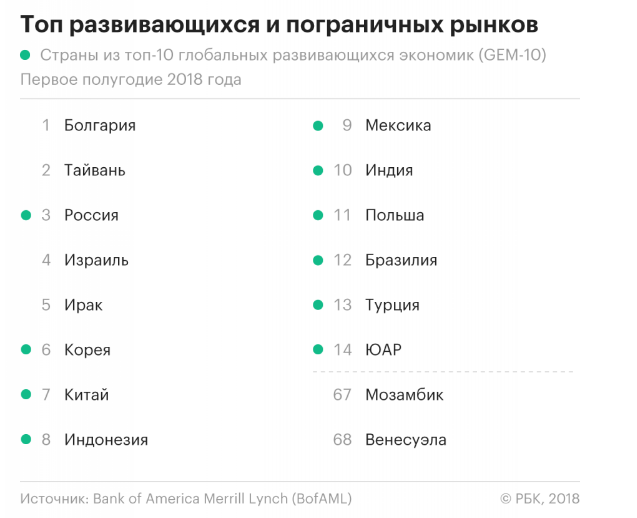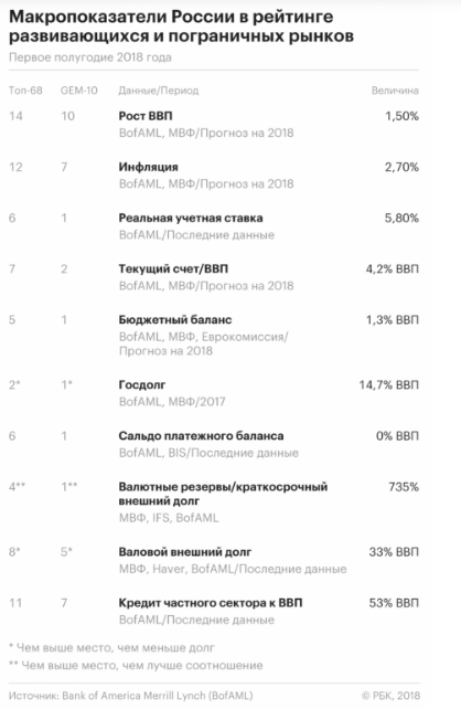 Россия заняла первое место в полугодовом рейтинге глобальных развивающихся рынков по макроэкономическим показателям, подготовленном BofAML. Страна обошла партнеров по БРИКС и сохранила лидерский статус, полученный в январе