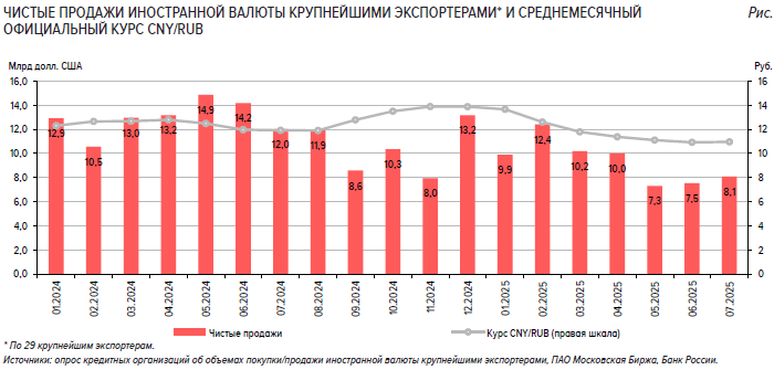 «Чистые продажи 29 компаний из числа крупнейших российских экспортеров в июле 2025 г. составили 8,1 млрд долл. США, увеличившись на 7% относительно предыдущего месяца (в июне — 7,5 млрд долл. США). При этом среднедневные чистые продажи сократились (на 11% м/м) из-за большего количества рабочих дней в июле относительно июня и составили 351 млн долл. США. Равномерное распределение продаж иностранной валюты экспортерами внутри месяца способствовало сглаживанию курсовых колебаний на валютном рынке», — сообщил ЦБ.
