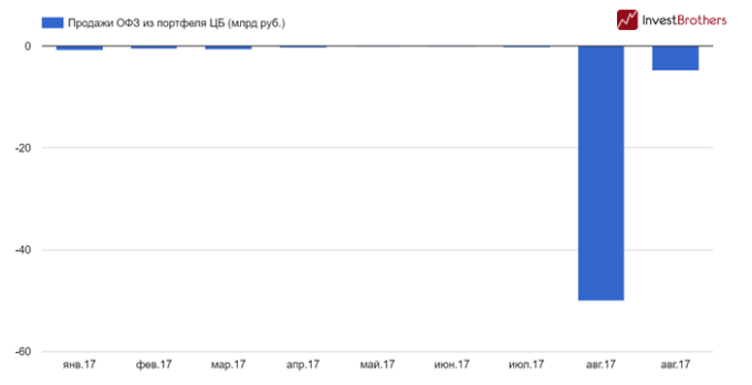 Активно продавать бумаги Центробанк стал лишь с конца лета. Так за весь 2017 г. он реализовал ОФЗ на 57,6 млрд рублей, из них 54,9 млрд пришлись на август-сентябрь.