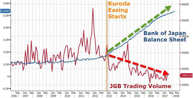 Банк Японии скупил более 40% обращающихся на рынке гособлигаций, сократив возможности других участников по покупке и продаже бумаг. Ряд покупателей, включая пенсионные фонды и страховые компании, тоже склонны следовать стратегии приобретения и удержания бондов.