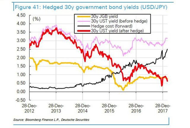 Яркий пример — долговой рынок США. В первые месяцы года мы наблюдали сильнейшую распродажу, при этом доллар слабел. Инвесторы выходили из бумаг. Вроде бы это логичная история, когда рынки ждут повышения ставок, но все не совсем так, как кажется на первый взгляд. Важно отметить, что стоимость вложений в трежерис с учетом валютного хеджа для иностранных инвесторов стала менее привлекательна, чем вложения в свои бумаги, несмотря на возросшую доходность.