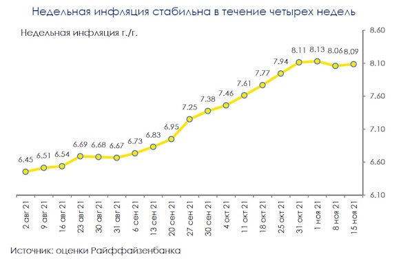 По итогам недели, завершившейся 15 ноября, годовой рост индекса потребительских цен в России, согласно Росстату, составил 8,09% против 8,06% неделей ранее и 8,13% на начало месяца.