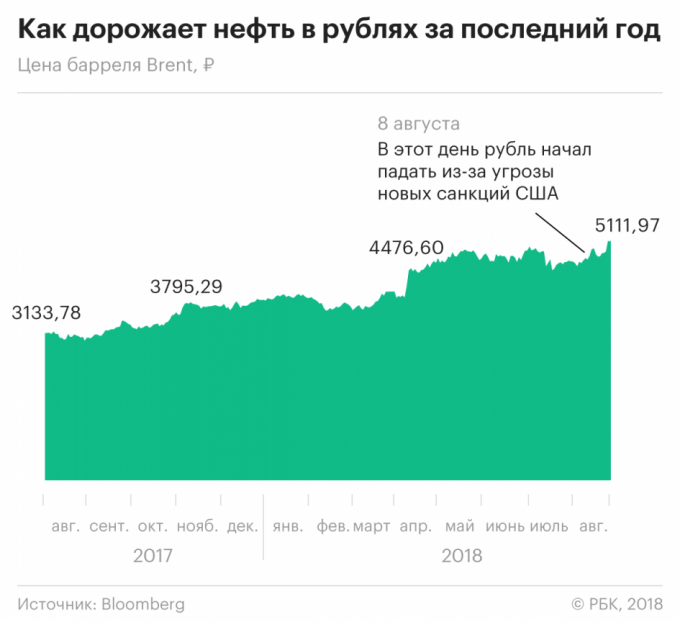 В пятницу, 24 августа, баррель Brent подорожал до рекордных 5112 руб. С начала 2018 года рублевая цена нефти выросла на 33%, с отметки 3830 руб. в начале января.