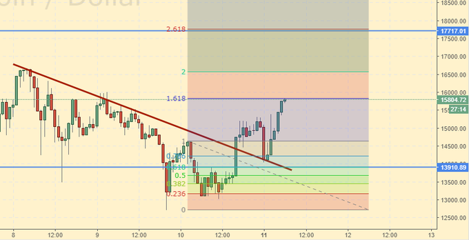 Наблюдаем на рынке подобие стабилизации. Не понятно насколько долго она продлится. До 18-го числа, запуска торгов на Чикагской бирже, есть еще неделя. А за неделю на данном рынке может произойти масса интересного. Если сравнивать начало торговлей фьючерсом на Биткоин с IPO акций «дот комов» на бирже, на реальной бирже, то скорее всего, после начала торгов мы будем наблюдать коррекцию в район 8000 – 10000, после чего рост может быть продолжен, но уже в следующем году.