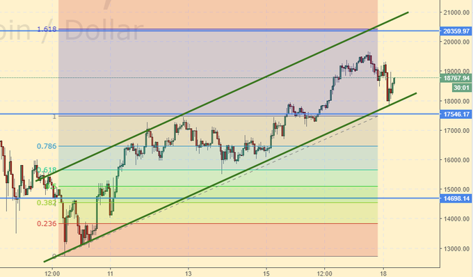 На выходных понервничали и посетили отметку 19666. После того как мы прошли 15800 и по сути исчез последний вменяемый ориентир, дальнейшие попытки понять где и когда закончится восходящая вакханалия можно оставить. Сегодня должны начаться торги фьючерсом на Биткоин на Чикагской бирже. Продолжаем оставаться скептиками, уверенности в продолжении безоткатного роста нет, так как ничего кроме спроса, основанного на эмоциях, нет. Чем выше будем подниматься, тем сильнее будет разочарование толпы, что в дальнейшем, уже после сильной коррекции отпугнет народ от экспериментов с криптовалютами.