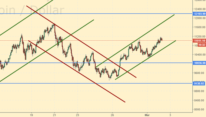 Рынок расширил восходящий канал и от 10300 вновь вернулся к 11000. Пока сохраняем позитивный настрой вместе с рынком. Ждем взятия 12000 для того чтобы поставить перед собой цель на 14000,  а может быть и на 20000. А, что на счет продаж? Можно пробовать сейчас, со стоп-ордером на 11300. Шансы не велики, но так будет всегда при отработке любой идеи.