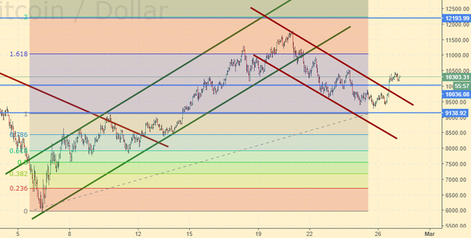 На рынке продолжается тактическая борьба. Пока все очень просто с точки зрения анализа. Если цены выше 10000, то у власти быки, если ниже, то медведи. Вчерашний день полностью оставляем за быками. Мы вновь поднялись выше 10000. И где же здесь покупать? Собственно, прямо здесь в районе 10300 и надо брать. Промедление в данной ситуации приведет к тому, что купите в конце дня уже по 12000.