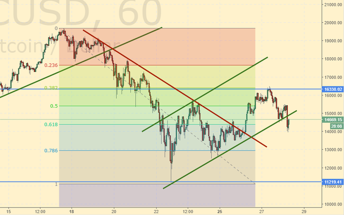 Видим, что рынок не торопится расти. Более того, перед нами снова угроза очередного обрушения. Рынок выглядит тяжелым, и мы вправе рассчитывать на снижение к 13000. Что после этого последует, рост или падение, сказать сложно. Скорее, за этим последует Новый год, а дальше уже будем разбираться в январе. Пока поводов для роста у криптовалюты нет, и их будет еще меньше в будущем если рынок сходит вниз, куда-то на 5000. Останутся поклонники забавы, но не более. Толпа разбежится в ужасе. А деньги именно у толпы.