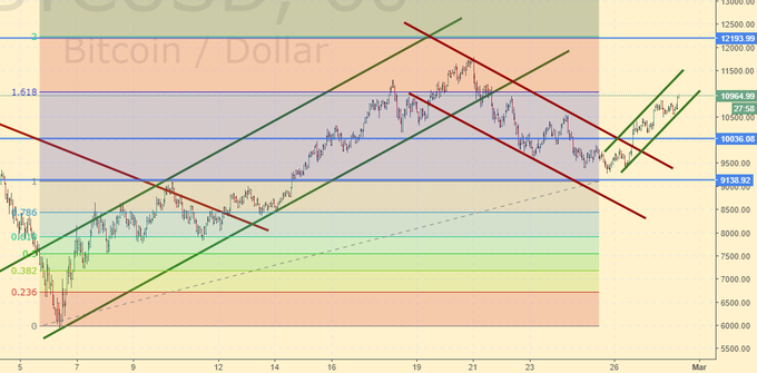 Пока быки держат ситуацию под контролем. Мы неспешно растем, точнее подкрадываемся к 12200. Если цены преодолеют данный рубеж, то рост рынка продолжится до 14000. В противном случае есть масса вариантов, самый радикальный из которых, это падение и забвение, то чего так многие боятся. Но пока цены выше 10000 думать о негативном исходе всей этой истории нет никакого смысла. Пока мы цветем и пахнем.