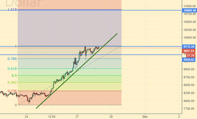 Покупка: поздравляем всех, кто взял профит на 9500, при покупке от 8000. Рынок улетает в космос… в таких условиях покупать вдогонку можно только на малых интервалах с очень короткими стоп ордерами. Кто остался в позиции, подожмите стоп-ордера до 9400.
