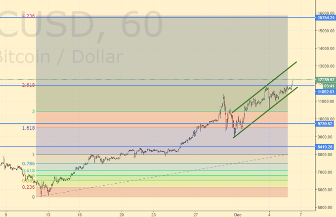 Рынок ушел выше 12000 и отправился на 15800. Если и данный рубеж будет взят, то дальнейший рост Биткоина может стать лавинообразным. Не исключено, что рынок закладывается в криптовалюту, продолжая оценивать перспективы развития всего сектора. Психологически не просто покупать на данных уровнях, учитывая то, что год назад Биткоин стоил в 25 раз меньше. С точки зрения спекулятивных идей, работа с Биткоин, именно с текущих высот, в расчете на дальнейший рост не самая лучшая. Если купить по 12000 и продать по 18000, то это 50% прибыли. А будет ли рынок так высоко? Посмотрим.