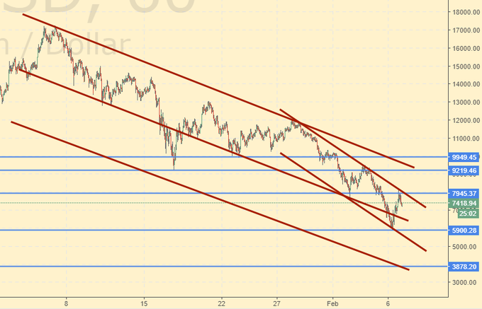 Текущая ситуация в большей степени располагает к размышлениям, чем к торговле. Впрочем, тем, кто вчера купил по 6000, а мы писали об этом, стоит удерживать позиции. Ход к 10000 – это максимум из того, что на сегодняшний день может показать рынок, но этого и хватит для фиксации прибыли от покупки. Проблема в том, что данный рост может не состояться. Пока мы под 8000 существует риск углубления кризиса и хода куда-то под 5000.