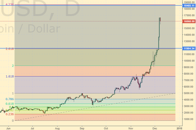 Рынок легко, будто на адреналине, перепрыгнул через нашу цель на 15800. Дальнейшее прогнозирование принимает оттенок сюрреализма. Для поиска возможных остановок рынка приходится смотреть на дневной масштаб и… и завидовать тем, кто успел сесть в поезд. Совсем недавно человек покупающий биткоин по 1000 долларов казался… скажем так, недальновидным. Видим, что с натяжкой, здесь уже вряд ли техника работает, но как-то можно обозначить следующий уровень на 18500. Не забываем, что 18-го числа, откроются торги в Чикаго. И все может в этом мире поменять, причем резко. Замечу, вряд ли Биткоин будет убит полностью. То есть 1000 долларов (одна тысяча, не десять), то он будет стоить. И именно из этого надо исходить в своих осторожных прогнозах будущего сего техно-чуда.