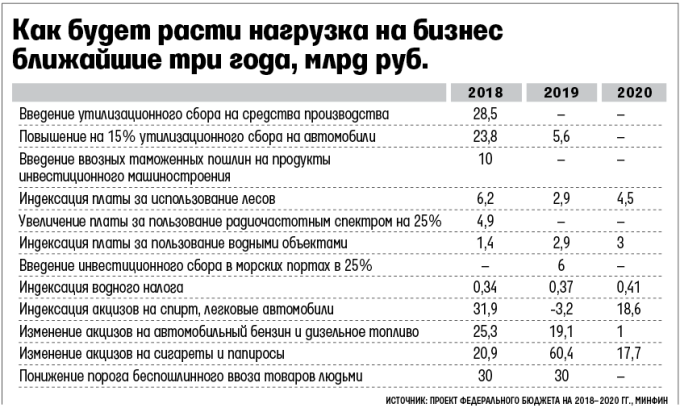 Больше 100 млрд руб. придется доплатить бизнесу только в 2018 г. из-за различных новых сборов, которые правительство вписало в проект трехлетнего бюджета. Это нарушает договоренности о неизменности фискальной нагрузки, напомнили в письме Владимиру Путину президенты четырех бизнес-объединений – РСПП, «Деловой России», ТПП и «Опоры России» («Ведомости» ознакомились с его копией, подлинность подтвердили президенты «Опоры России» и «Деловой России», член бюро РСПП).