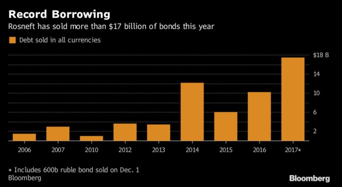 Bloomberg подсчитал, что компания, благодаря выпуску облигаций в текущем году, добавила к своему долгу еще более 17 млрд долларов США. Это рекордный уровень заимствований ВИНК. Возможно, «Роснефть» опасается, что новая порция санкций со стороны Соединенных Штатов может быть направлена против финансового сектора и подвесит российский кредитный рынок. Информационное агентство оценивает долларовые обязательства российской ВИНК, взятые ею на себя еще до санкций, в 3,6 млрд долларов, включая 1,1 млрд долларов по облигациям, обязательства по которым наступают в марте 2018 г.