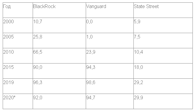 За период 2000-2020 гг. доли всех трех компаний «Большой тройки» увеличивались: у BlackRock – с 3,7 до 7,6 процента (в два с лишним раза); у State Street – с 1,9 до 5,6 процента (почти в три раза); у Vanguard – с 1,5 до 9,8 процента (в 6,5 раза). На сегодняшний день по участию в акционерном капитале группы S&P 500 на первом месте оказалась компания Vanguard. В совокупности участие «Большой тройки» в акционерном капитале группы S&P 500 приближается к одной четверти.