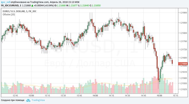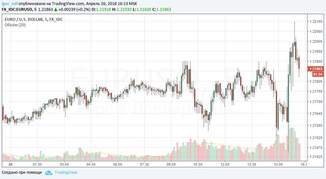 После этого рынок очень сильно ждал выступления Марио Драги. Оно началось в 15:30 по московскому времени. До этого реакция рынка была весьма сдержанной. Участники рынка начали продавать единую европейскую валюту. В паре с долларом она опустилась в моменте в район 1,2150, но затем практически вернулась к уровням, которые были до момента публикации итогов заседания.