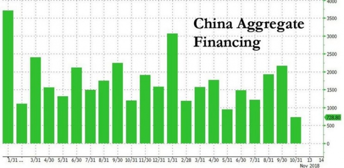 Несколько дней спустя Пекин представил еще один неприятный сюрприз, когда НБК объявил, что общее социальное финансирование (TSF) упало с 2,2 трлн юаней в сентябре до 729 млрд в октябре.