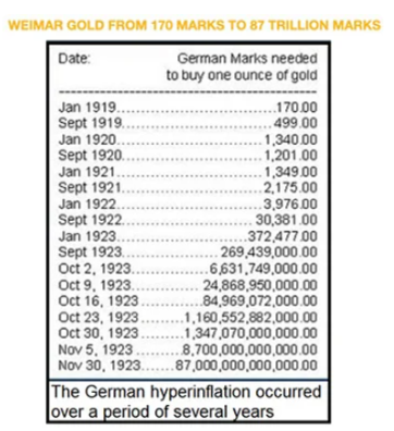 Следующая фаза будет гиперинфляционной, и она, вероятно, начнется в 2021 году. Достаточно взглянуть на таблицу, показывающую сколько немецких марок требовалось для покупки одной унции золота во времена Веймарской республики.