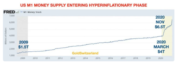 Еще одно подтверждение приближающейся гиперинфляции — денежная масса M1 в США. В 2009 году, когда закончился Великий финансовый кризис, M1 составлял $1,5 триллиона долларов. А через 11 лет «экономического бума» в марте 2020 года M1 увеличился с $2,5 до $4 трлн. Ясно, что прирост вызван не бумом, а увеличивающимся долгом. Таким образом, потребовалось 11 лет, чтобы денежная масса поднялась на $2,5 трлн, и всего 9 месяцев, чтобы добавить еще $2,5 трлн.