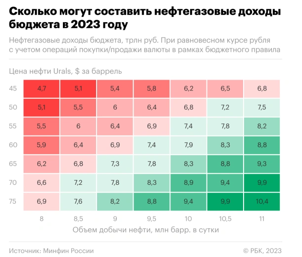 Сокращение нефтегазовых доходов — один из рисков для российского бюджета в 2023 году, признавал министр финансов Антон Силуанов. Введение потолка цен на нефть из России (на уровне $60 за баррель), эмбарго Евросоюза на импорт российской сырой нефти (вступили в силу в декабре) и нефтепродуктов (начнет действовать с 5 февраля), а также неясные перспективы спроса на нефть со стороны азиатских экономик повышают вероятность их проседания.
