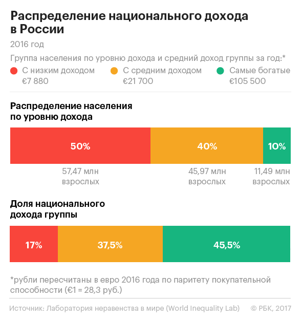 Доход, приходящийся в среднем на одного взрослого россиянина, в 2016 году составил €23,2 тыс. за год, что по методологии авторов соответствует около 55 тыс. руб. в месяц. Но на самом деле доходы распределены крайне неравномерно: 50% населения (57,5 млн человек) получили в среднем только по €7,8 тыс. Наиболее обеспеченные 10% граждан (верхний дециль) располагали средним доходом в €105,5 тыс., следует из расчетов исследователей.