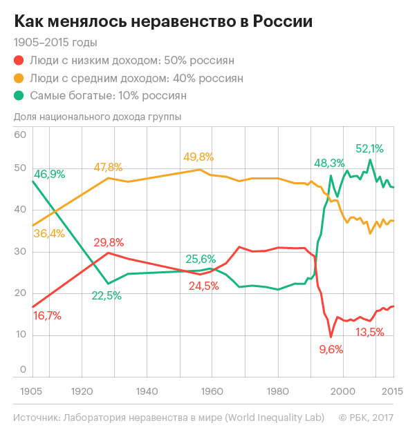 Переход к рыночной экономике после распада СССР привел к росту разрыва в доходах между бедными и богатыми. Сейчас на долю менее состоятельной половины населения приходится только 17% национального дохода — так было сто лет назад