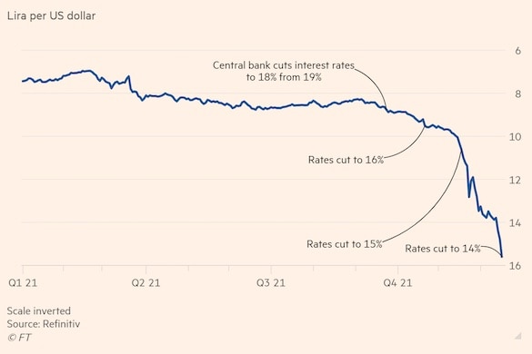 Меньше чем за полгода ставка центробанка была срезана на 500 базисных пунктов, невзирая на предупреждения экономистов и панику валютного рынка, который отреагировал обвалом лиры на 50% с начала года.