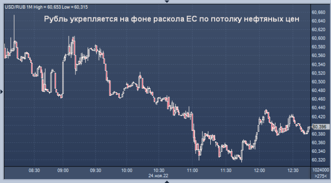 «Рубль, вероятно, останется вблизи текущего уровня, и любое ослабление к концу года должно быть ограничено 62–64 долларами за доллар, принимая во внимание предлагаемый потолок цен на российскую нефть в размере 65–70 долларов, который кажется рождественским подарком», — сказал стратег Локо Банка Дмитрий Полевой.