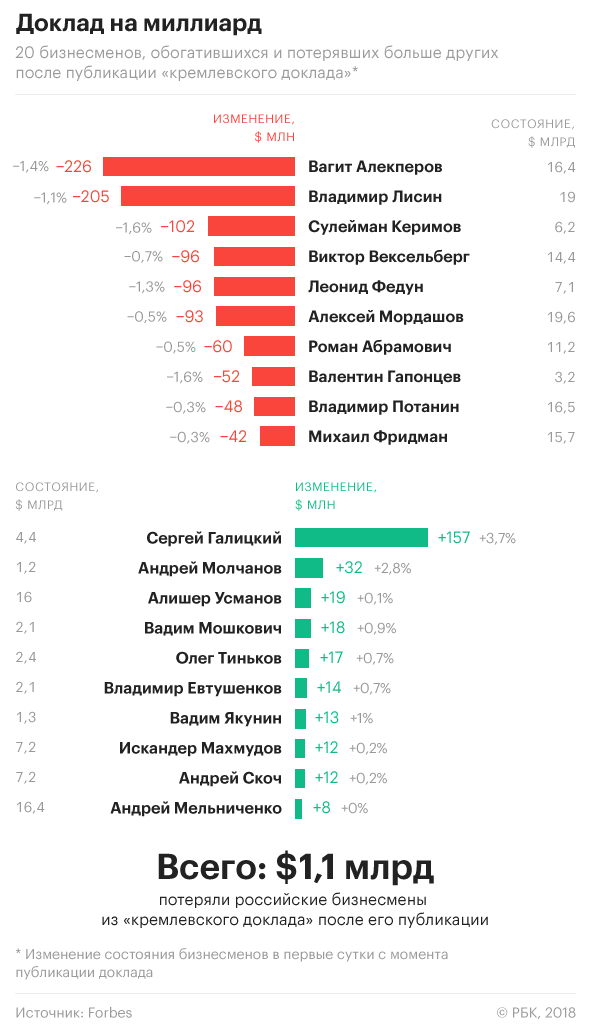 После публикации доклада, в котором оказались 96 российских бизнесменов, их совокупное состояние уменьшилось на $1,06 млрд по состоянию на 21:00 мск. К этому времени Московская и Лондонская биржи, где торгуются основные активы российских миллиардеров, уже закрыты.