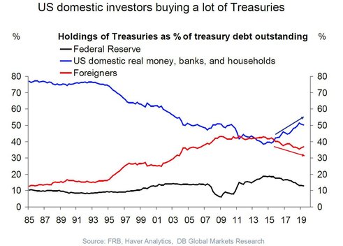 Именно частные инвесторы выступают главным источником спроса на облигации США. Вместе с тем, в Deutsche Bank полагают, что внешний спрос хотя и может быть более скромным, но все же будет в 2020 г. положительным. В противном случае можно ожидать новых потрясений на рынке РЕПО, тогда ФРС сможет более активно вмешиваться в рынок облигаций, скупая еще больше бумаг.