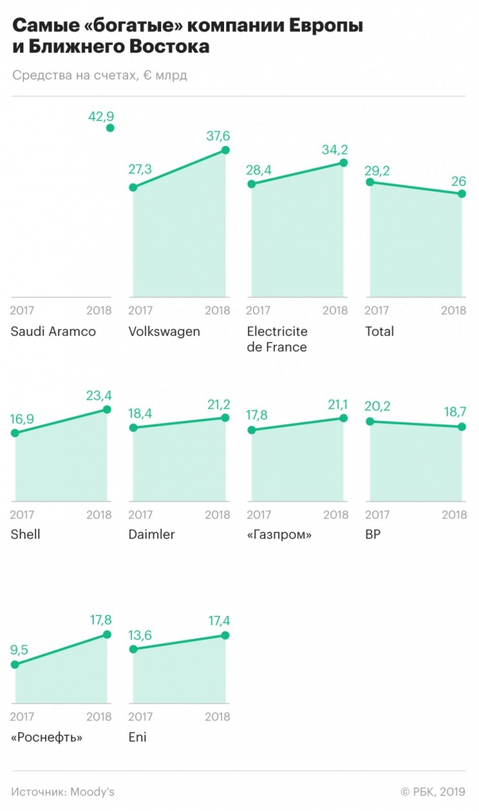 Всего участники рейтинга Moody`s из Европы, Ближнего Востока и Африки в 2018 году нарастили запасы ликвидности на 15%, до €1,1 трлн. Помимо саудовской и российских компаний в десятку вошли немецкие автопроизводители Volkswagen и Daimler, французские Electricite de France и Total, нидерландский Royal Dutch Shell, британская BP и итальянская Eni. Семь из этих компаний за год увеличили запасы ликвидности. Наибольший рост показала Volkswagen: ее денежные средства увеличились на €10 млрд, поскольку годом ранее компания выплачивала многомиллиардные штрафы из-за так называемого дизельного скандала, раскрытого в США. Она оснащала продаваемые в Европе и США автомобили программным обеспечением, которое во время проведения тестов в десятки раз занижало количество вредных выбросов. В 2018 году таких больших расходов у нее уже не было.