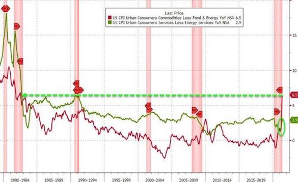 В то время как инфляция на рынке услуг притормозила к 2,9%, скорость роста цен на товары подскочила до 6,5% год к году — максимального значения с 1982 года, когда в Белом доме хозяйничала администрация Рональда Рейгана.