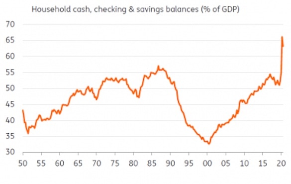 Хотя ВВП США по итогам прошлого года показал сильнейшее падение с 1946 года, на благосостоянии американцев это никак не отразилось: более того, масштабные программы помощи, оплаченные за счет дефицита бюджета и печатного станка ФРС, оставили на руках у населения рекордные объемы денег. Запасы наличных и депозиты физлиц в США пополнились на 2,4 трлн долларов за год, а в относительном размере превысили рекорды второй половины 1980х — 65% ВВП, отмечает экономист ING Джейммс Найтли.
