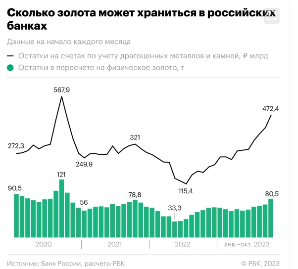 Похожая тенденция действительно наблюдалась в предыдущие годы осенью. Так, в 2020 году наибольший объем физического золота в банках был достигнут 1 сентября (почти 121 т), в 2021 году — 1 октября (78,8 т), а в 2022 году — 1 декабря (62,4 т). При этом 2022 год можно считать нетипичным: объемы золота на балансах кредитных организаций резко упали до 33,3 т и медленно восстанавливались во второй половине года, следует из данных ЦБ.
