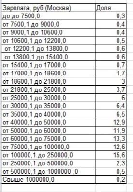 Для это воспользуемся официальной статистикой по распределению населения по зарплате. Нашел интересную табличку за 2017 год, из которой, кстати, можно получить представление о неравенстве доходов в Москве.