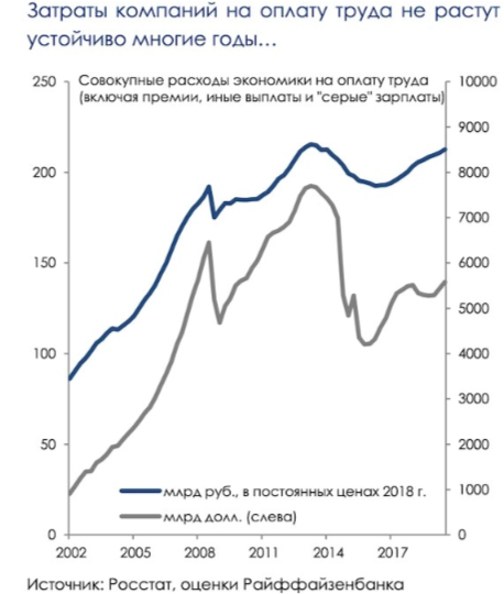 С точки зрения покупательной способности работающего населения последние 8 лет оказались для экономики потерянными: с учетом взлетов падений уровень расходов на оплату труда колебался примерно вокруг одного значения — 32,5 трлн рублей в год.
