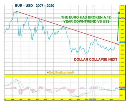 График пары евро и доллара выглядит очень медвежьим для американской валюты. После 9-летней коррекции евро прорывается вверх по отношению к валюте США, и его динамика весьма оптимистична. Курс евро уже вырос на 12% в этом году и, вероятно, значительно укрепится в 2021, поскольку падение доллара только ускоряется.