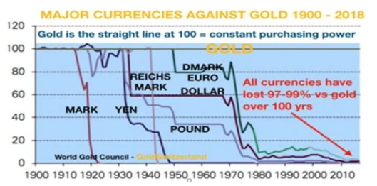 График выше отчетливо показывает, что произошло со всеми валютами по отношению к золоту за последние 100 лет, и так происходит на протяжении всей истории.