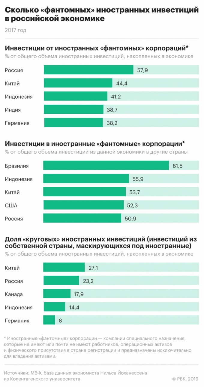 Более половины накопленных иностранных инвестиций в экономику России приходится на «фантомные» зарубежные корпорации, то есть осуществлено компаниями-пустышками, скрывающими страну — истинный источник этих вложений. Такие данные приводятся в исследовании «Что является подлинным, а что нет в глобальной системе прямых иностранных инвестиций?», опубликованном Международным валютным фондом (МВФ).