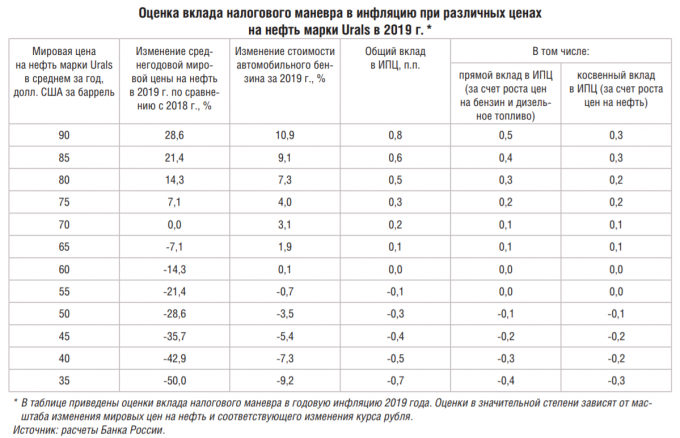 Так, если цены на нефть упадут сильно, то эффект от налогового маневра окажется отрицательным, то есть темпы роста инфляции начнут замедляться. Всего эффект от маневра ЦБ оценивает в диапазоне от минус 0,7 процентного пункта при цене на нефть марки Urals в $35 за баррель до плюс 0,8 процентного пункта при цене в $90 за баррель. В случае, если цена на нефть в следующем году по сравнению с этим годом не изменится, эффект от налогового маневра составит плюс 0,2 процентного пункта к инфляции.