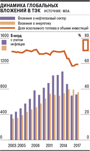 Вложения в ископаемые виды топлива оказались на 34% ниже уровня 2014 года. Однако в прошлом году доля инвестиций в этот сектор выросла впервые за четыре года и составила 59% (плюс один процентный пункт). Согласно долгосрочному прогнозу агентства, в «устойчивом» сценарии эта доля должна к 2030 году снизиться до 40%. При этом в 2018 году инвестиции в возобновляемую энергетику могут вновь сократиться, предупреждают в МЭА,— рост использования солнечных панелей, где издержки на производство одного мегаватта сократились на 15% в прошлом году, не позволил компенсировать снижение в ветро- и гидроэнергетике.