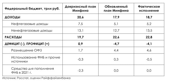 Дефицит бюджета, таким образом, достиг 4,102 трлн рублей, или 3,8% ВВП. Он был почти полностью профинансирован за счет долга, который, в свою очередь, через госбанки примерно на 20% оплатил «печатный станок» ЦБ (он влил в банковскую систему 807 млрд рублей долгосрочных кредитов репо).