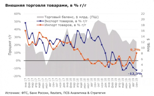 Статистика Федеральной таможенной службы по месяцам рисует еще более мрачную картину: на конец сентября спад достигает 12,3%, отмечает главный аналитик Промсвязьбанка Денис Попов.